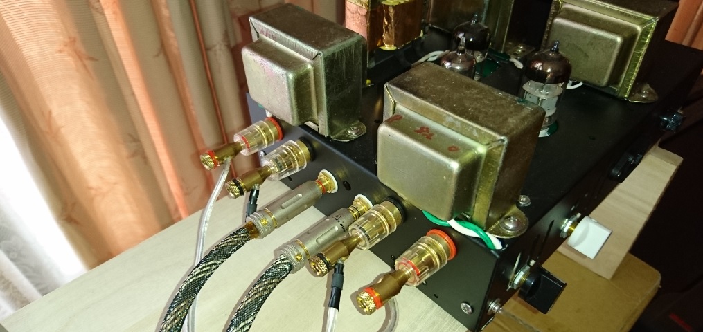 Tube amplifier rear view center RCA connector (L/R) connect to DAC pre-amplifier other out side is speaker cable ...connect to speakers |